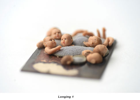 Veronica Ellran created a cluster of small works, on the verge of jewels, which come together to form a private time capsule, echoing the desire to be a mother alongside the longing for a child, translated into an obsessive repetition of a baby doll element in different variations.